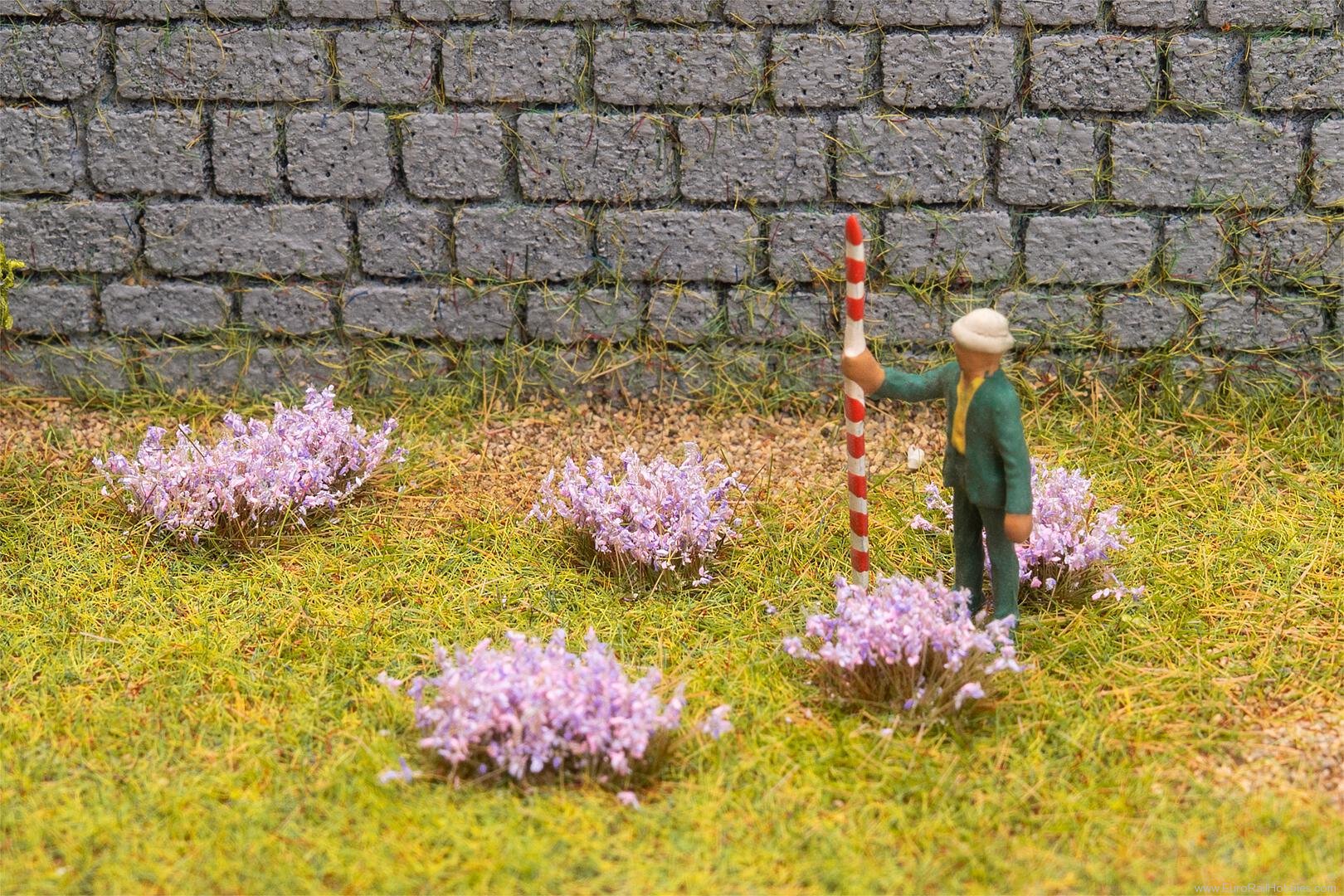 Small, irregular flower clusters in purple to stick on - perfect for enlivening paths, gardens, parks or meadows and adding a natural, detailed touch to the model landscape.