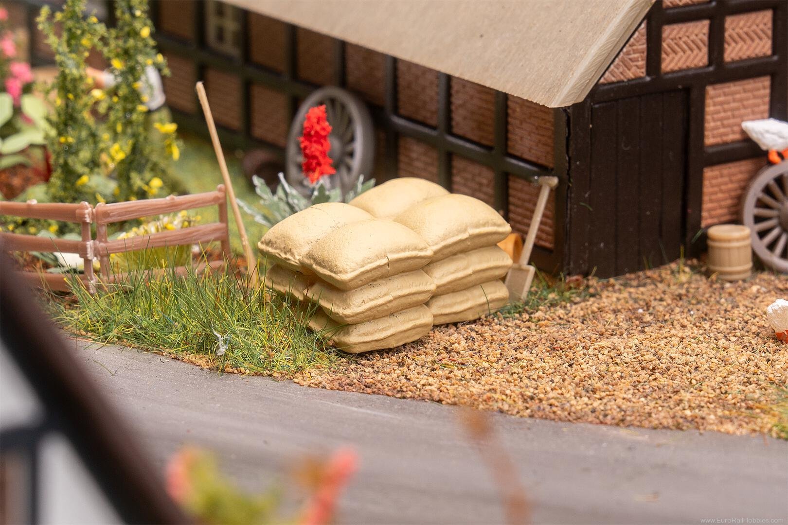 Tidiness is a must! Five realistically modelled stacks of bright fabric sacks are ideal for decorating storage rooms, goods halls or rural scenes. Whether grain, flour or other bulk goods - these small details liven up the modelling world.