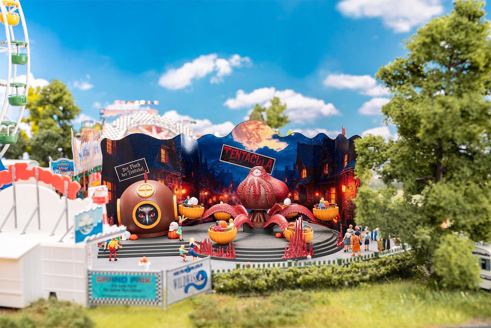 Underwater horror in miniature format - a highlight for every funfair! This funfair attraction takes your miniature visitors into a creepy underwater world. An imposing octopus sits enthroned in the centre, holding the gondolas and turning with them. The set is decorated with an atmospheric creepy background and lots of lovely details. Thanks to the integrated DC geared motor with precise circuit board control, the rotation speed can be regulated effortlessly. The attraction is simply operated via 5 - 12 V DC - so nothing stands in the way of unforgettable underwater horror!