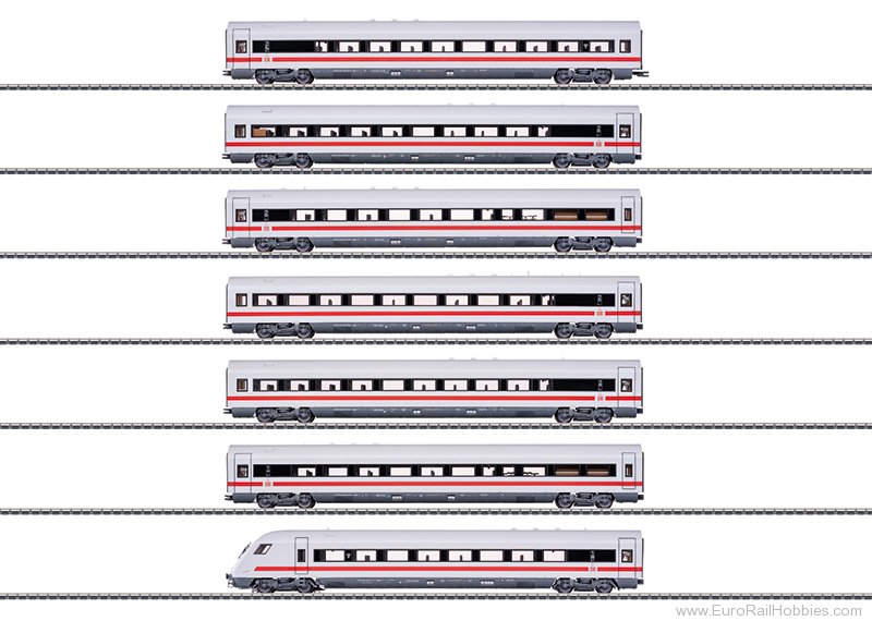 Prototype: German Railroad (DB aG) ICE express train passenger car set comprising 7 former Metropolitan passenger cars of various types in ICE/IC livery. One type apmz 116.0 express train passenger car, 2nd class, running number 1. 1x type apmz 116.1 express train passenger car, 2nd class, running number 2. 1x type apmkz 116.6 express train passenger car, 2nd class, running number 3. One type apmz 116.4 express train passenger car, 2nd class, running number 4. One type apmz 116.2 express train passenger car, 2nd class, running number 5. One type apmkz 116.6 express train passenger car, 1st class, running number 6. One type apmbzf 116.8, express train control car, 1st class, running number 7. Train route Cologne - Berlin Ostbahnhof, as ICE 1051. The cars look as they did after 2015.