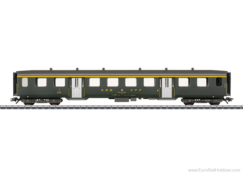 Prototype: Swiss Federal Railways (SBB CFF FFS) lightweight steel car, 1st class, with four-leaf doors and two entry doors per side. Fir-green paint scheme. The car looks as it did around 1990.