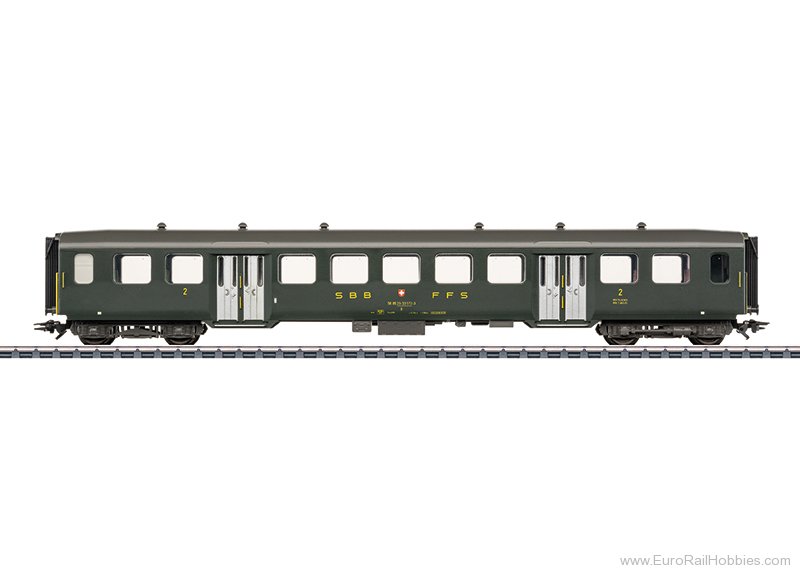 Prototype: Swiss Federal Railways (SBB/CFF/FFS) lightweight steel car, 2nd class, with two three-leaf doors and two entry doors per side. Fir-green paint scheme. The car looks as it did around 1990.