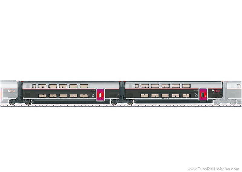 Model: This is a 2-part add-on car set for extending the TGV INOUI high-speed train, item 37798, to a ten-car train. The cars feature factory-installed interior lighting with maintenance-free, warm-white LEDs. a continuous electrical connection through the entire train supplies the interior lighting with power. Both intermediate cars are permanently coupled. The Jakobs trucks are equipped with a guide mechanism. The cars are a scale reproduction, which means the minimum radius for operation is 360 mm / 14-11/64" with sufficient clearance on both sides.
