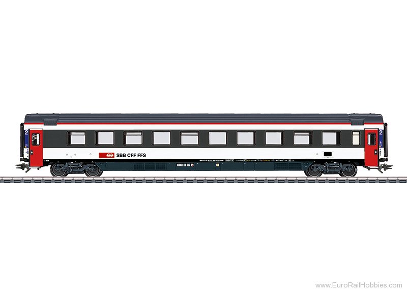Prototype: Swiss Federal Railways (SBB/CFF/FFS) type Bpm 2090, EuroCity express train passenger car, 2nd class. The car looks as it did starting in 2022.