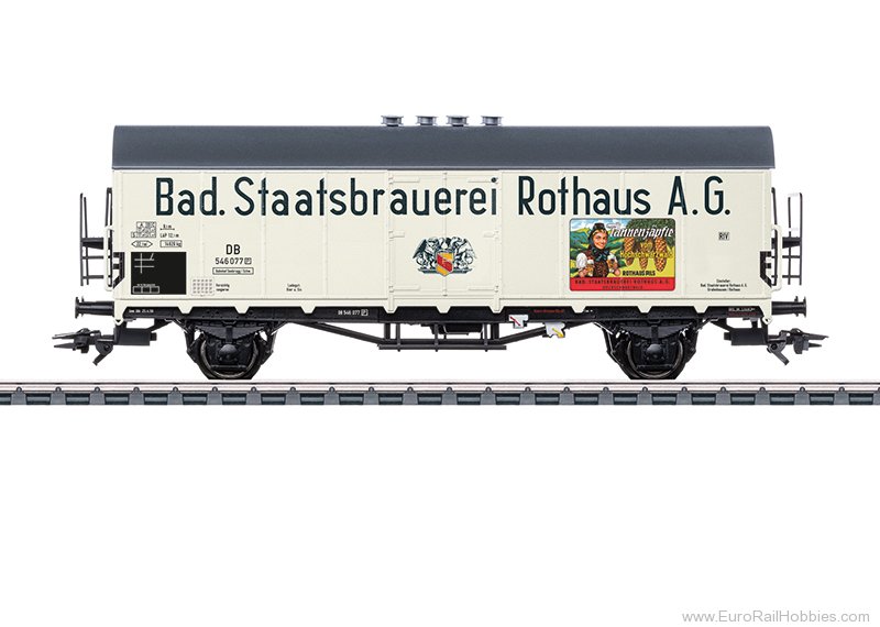 Prototype: a privately owned type Tnoms 35 beer refrigerator car with a fictitious design for Badische Staatsbrauerei Rothaus a. G., registered with the German Federal Railroad (DB). The design features the advertising inscription "Tannenzapfle vom Hochschwarzwald". The car has smooth walls of car construction panels as well as ice hatches and control platforms on the ends. The car looks as it did around 1958.