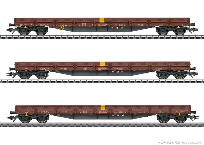 Prototype: Set of three German Railroad (DB aG) type Res-x four-axle, low-sided cars. European standard design with a length of 19.90 meters / 65 feet 3-1⁄2 inches. Reddish brown basic paint scheme. The cars look as they did starting in 2018.