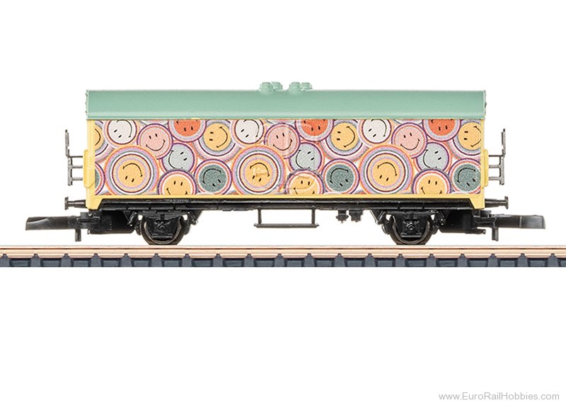 Model: This is the second edition of a SmileyWorld® car in Marklin Z-gauge. The car has an elaborate paint scheme. It also has black, nickel-plated solid wheel sets and separately applied metal platforms.
