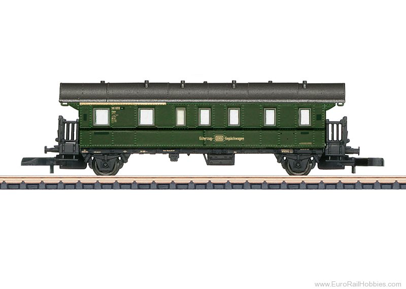 Type Pwghs two-axle auxiliary baggage car, based on a German Federal Railroad (DB) type BCi-29 "Donnerbuchse" (Thunder Box), 1st/2nd class. The car looks as it did in era III.
