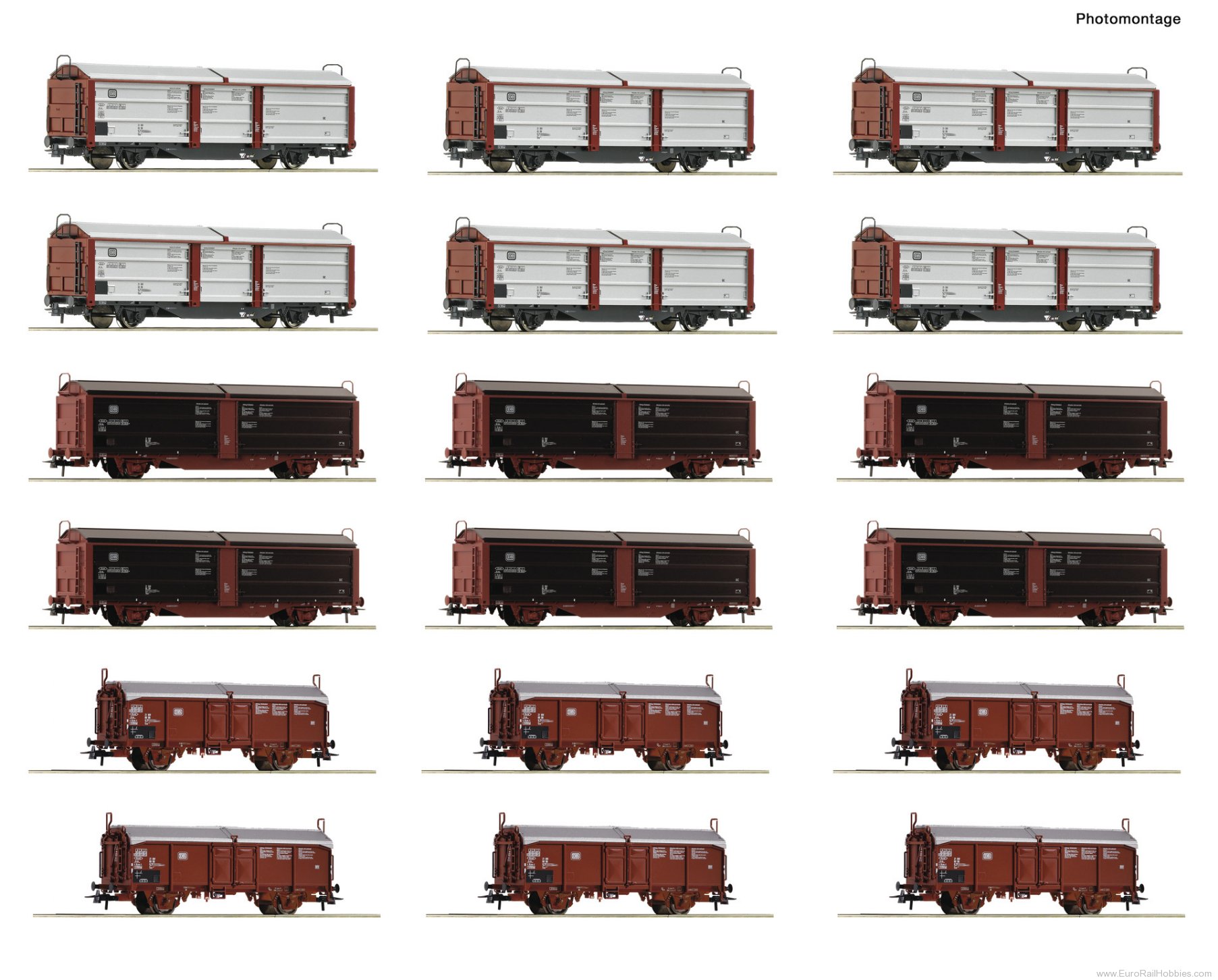 The set contains six sliding roof/sliding wall wagons, type Tbis 871, six sliding roof/sliding wall wagons, type Tbis 870, and six sliding roof wagons, type Tcs 850.