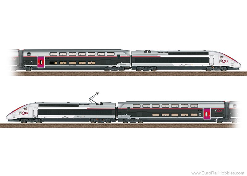 Model: The train is a 4-part set. Both power cars are motorized (M1 and M2). With digital decoder and extensive sound functions. There is a controlled high-performance motor in both powered end cars, centrally mounted. All 4 axles are powered by cardan shafts. Traction tires. Factory-installed interior lighting. The triple headlights and dual red marker lights change over with the direction of travel. They and the interior lighting will work in conventional operation and can be controlled digitally. The third headlight can be separately switched off digitally for the French light changeover (light function). Maintenance-free warm-white and red LEDs are used for the lighting. A buffer capacitor is fitted. Cabs in the powered end cars have interior details. Separately attached metal grab irons. The powered end car and transition cars are permanently coupled in pairs, with special close couplings and a guide mechanism. Additional guide mechanism in the Jakobs truck. The train has a power pickup feature whereby power is picked up from the pickup shoe in the powered end car at the front of the train. A continuous electrical connection through the entire train supplies the interior lighting with power. Each powered end car has 2 different single-arm pantograph designs, one with a slipper for the DB catenary and one with a slipper for the SNCF catenary. The pantographs work mechanically but are not wired to take power. The cars are a scale reproduction, which means the minimum radius for operation is 360 mm / 14-3/16" with sufficient clearance on both sides.