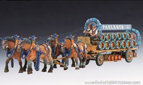 This special one-time edition from SCHUCO features a beautifully decorated Paulaner Brewery Wagon being pulled by 4 noble Holstein horses. The entire set is made of metal construction. Length is approximately 58 cm or 22.8".