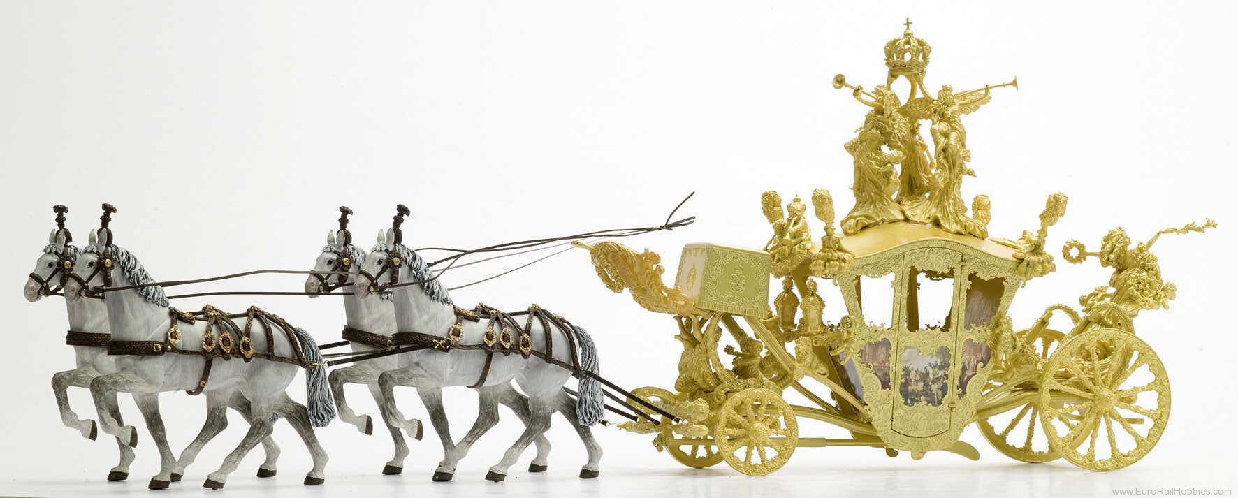 This special one-time edition from SCHUCO (DISTLER) features a beautifully decorated Cermonial COach of King Ludwig being pulled by 4 Noble horses including figures. The entire set is made of metal construction.