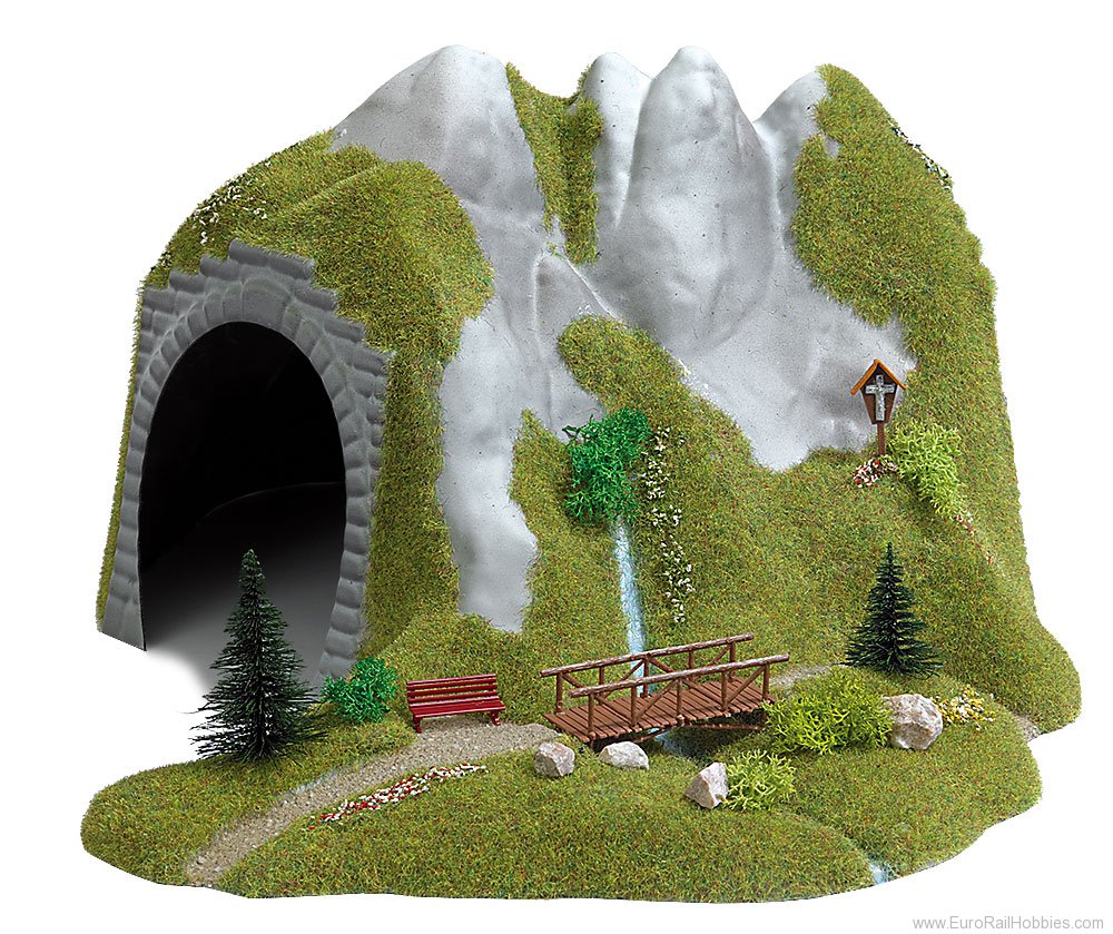 Reasonably priced, this curved tunnel is for use with a single track. A mountain stream, wooden footbridge, wayside cross, and a bench for tired hikers are molded into the side of the tunnel. Ideal for beginner layouts, and anyone new to the hobby of model railroading. Tunnel can be used with model train starter kits. Height of the tunnel portals: approx. 96 mm. Overall size: approx. 360 x 260 mm.