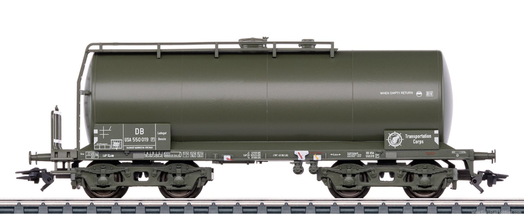 Prototype: Four-axis unitTank cars as a private car of the United States Transportation Corps (USTC). Hired by the Deutsche Bundesbahn (DB). Older design with pressed sheet bogies and brakeman's platform. Operating condition in the mid-1950s.