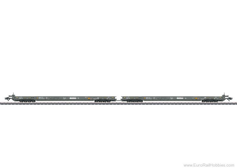 Prototype: Two type Saadkmms depressed floor flat cars for RAlpin, Inc. AG (Olten, Switzerland), for transit traffic on the "Rollende Landstraße" / "Rolling Road". Quarz gray basic paint scheme. The cars look as they did starting in 2018.