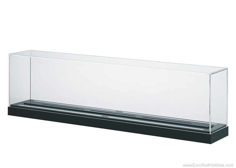 This is a working display case protected against dust and equipped with web-based browser control. This enables stationary running for the purpose of presenting a locomotive or similar unit. Practically all loco functions can be controlled on a smartphone, tablet, or laptop with the help of a user interface similar to that of Marklin Central Station 3. The LED lighting built into the display case base can also be controlled and dimmed. The lower part of the display case is made of black, highly polished Plexiglas. The electronics and connections are built into the base.