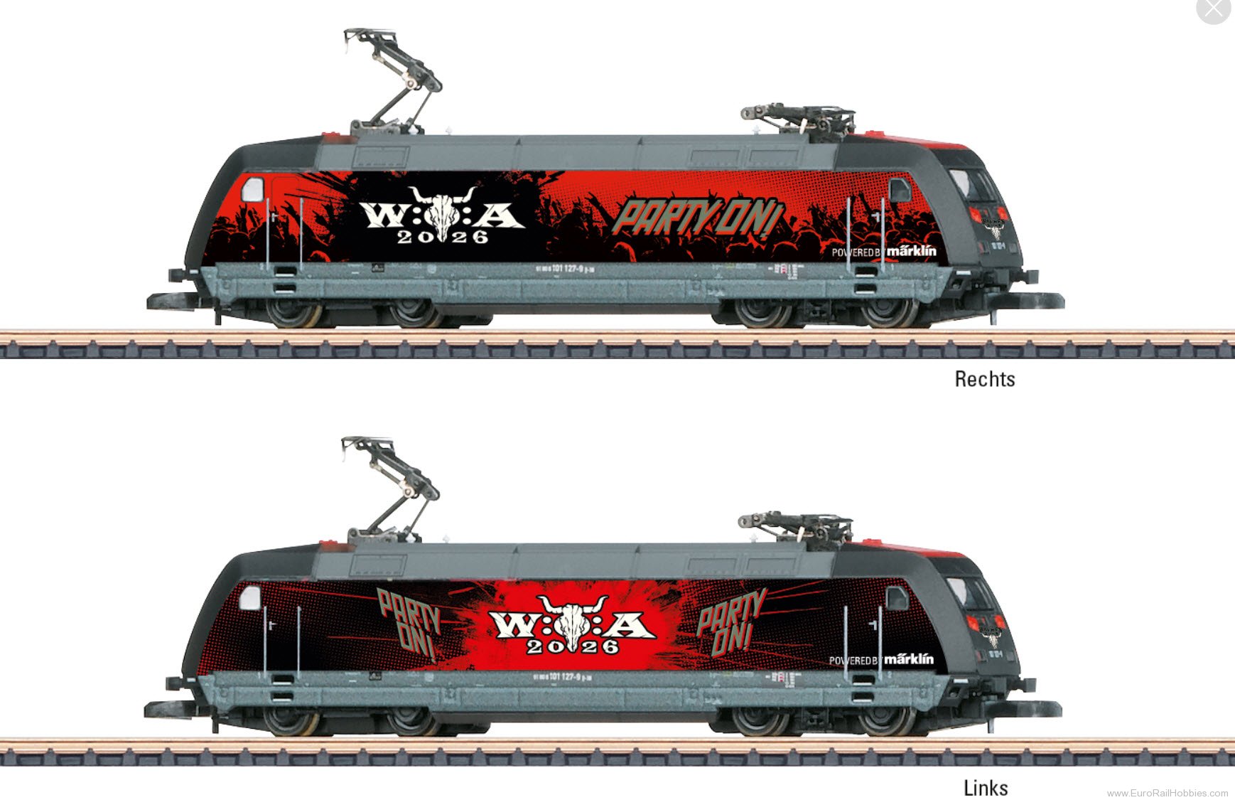 Both trucks are powered. Maintenance-free, warm white/red LEDs are used for the lighting. The current pickup can be switched to the overhead line. Length over the buffers 86 mm / 3-3/8".
