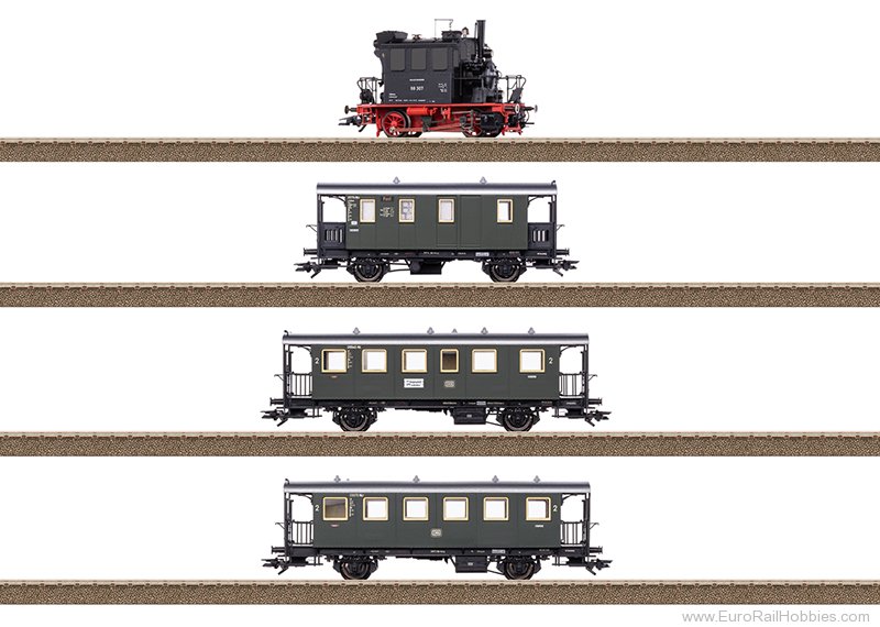 Prototype: German Federal Railroad (DB) class 98.3 Glaskasten (Glass Box) (former Bavarian PtL 2/2) with a jackshaft and triple headlights and three Bavarian style local railroad cars. One baggage and mail car and two passenger cars, 3rd class. The cars look as they did in Era III around 1957.