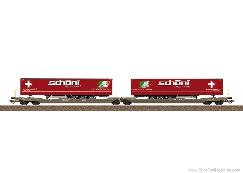 Model: Both flat car halves are constructed of metal and are mounted to pivot on the middle truck. Side folding tie bars are installed at the factory. These can be folded up for transporting containers or swap body containers. There are many separately applied details, such as steps, brake lines, and grab irons at the ends of the car. The car has type Y25 trucks. The buffer height conforms to NEM specifications. Holders for high and low version kingpins, brakeman's steps, and an air tank for the ends of the cars are included as parts that can be separately applied. Loaded with two curtain tarp semi-truck trailers lettered for the freight forwarder "Schöni". Length over the buffers approximately 39.3 cm / 15-1/2".