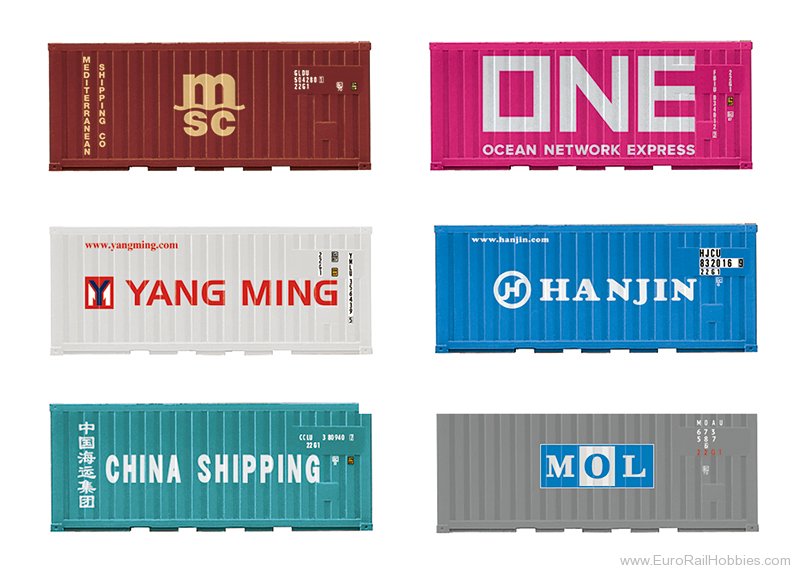 Prototype: Six 20-ft. standard box containers from different companies. The containers look as they currently do in era VI.