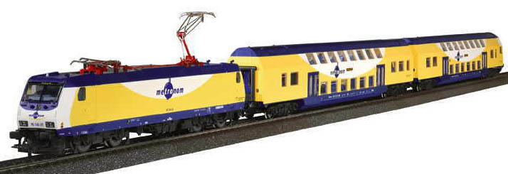 We have been able to secure a very limited number of the PIKO 58700 Metronom train sets. This set comes with an Electric BR 146 with a built-in Digital Decoder for Marklin Motorola. There are also 2 Bi-Level Cars, one of them being a Cab-Control Car. This is an Incredible Price Break-Through from Piko. These sets are "Extremely Limited" and at this price will sell out quickly. This set can be extended by adding the 57602 Metronom Bi-Level Coach.